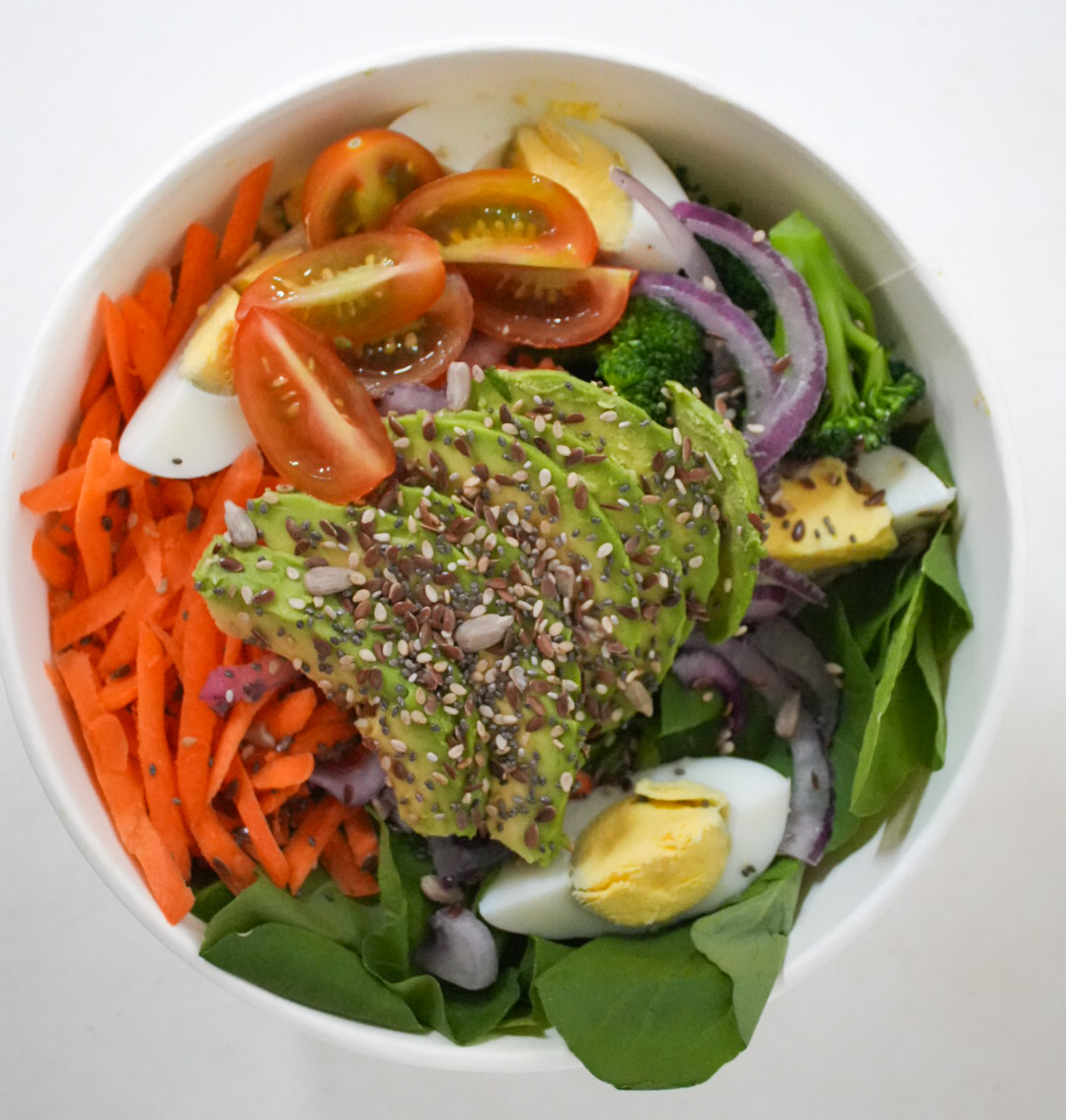 Palta, cherry, rúcula, zanahoria, huevo duro, zanahoria, cebolla morada, coliflor y mix de semillas