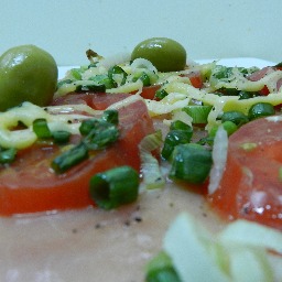 Masa con salsa, mozzarella, jamón crudo, tomate en rodajas, queso tybo, verdeo, pimienta negra, orégano y aceitunas ngeras (4 porciones)