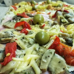 Masa con salsa, mozzarella, jamón cocido, hongos, queso tybo, oregano y aceitunas verdes (4 porciones)