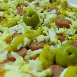 Masa con salsa, mozzarella, panceta ahumada, salchichas, huevo duro, mostaza, orégano y aceitunas verdes (4 porciones)
