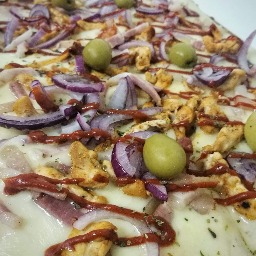 Masa con salsa, mozzarella, panceta ahumada, pollo salteado, salsa de ají, oregano y aceitunas verdes (4 porciones)