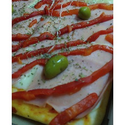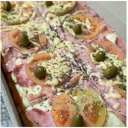 Masa con salsa, mozzarella, jamon cocido, morrones en tiras, orégano y aceitunas verdes (4 porciones)