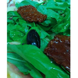 Masa con salsa, mozzarella, jamon crudo, rucula, pimienta negra, aceite de oliva y aceitunas negras (4 porciones)