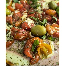 Masa con salsa, mozzarella, jamon cocido, tomates cherry asados, queso tybo, albahaca, oregano y aceitunas verdes. (4 porciones)
