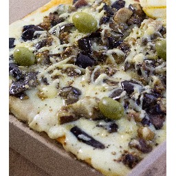 Masa con salsa, mozzarella, berenjenas en cubo asadas, aceite de ajo, queso provolone, albahaca, oregano y aceitunas verdes (4 porciones)