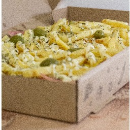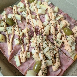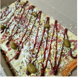 Masa con salsa, mozzarella, jamon cocido, huevo, papas fritas, aderezo de queso fundido, oregano y aceitunas verdes (4 porciones)
