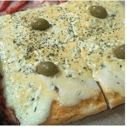 Masa con salsa, mozzarella, queso azul, provolone, queso tybo, oregano y aceitunas verdes (4 porciones)