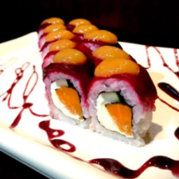 Palta, queos phila y verdeo en tempura, cubierto con tartar de salmón y chalaquita