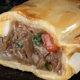 Carne de vacío braseada con vino blanco a fuego lento, desmechada, combinada con salteado de cebolla, morrón, verdeo, provoleta estacionada y muzzarella