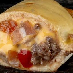 Carne molida, queso cheddar, muzzarella, cebolla, perejil, comino, y oregano