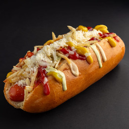 Pan de papa, salchicha, cobolla, papas pay, ketchutp, mayonesa, mostaza, salsa tártara y queso regiannito