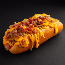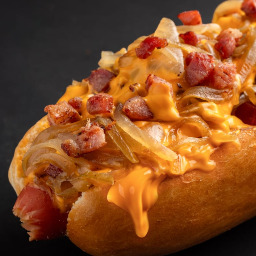 Pan de papa, salchicha, cebolla caramelo, cheddar y bacon