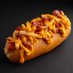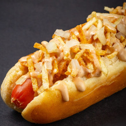 Pan de papa, salchicha, salsa bourbon, bastones de papas, cheddar y bacon
